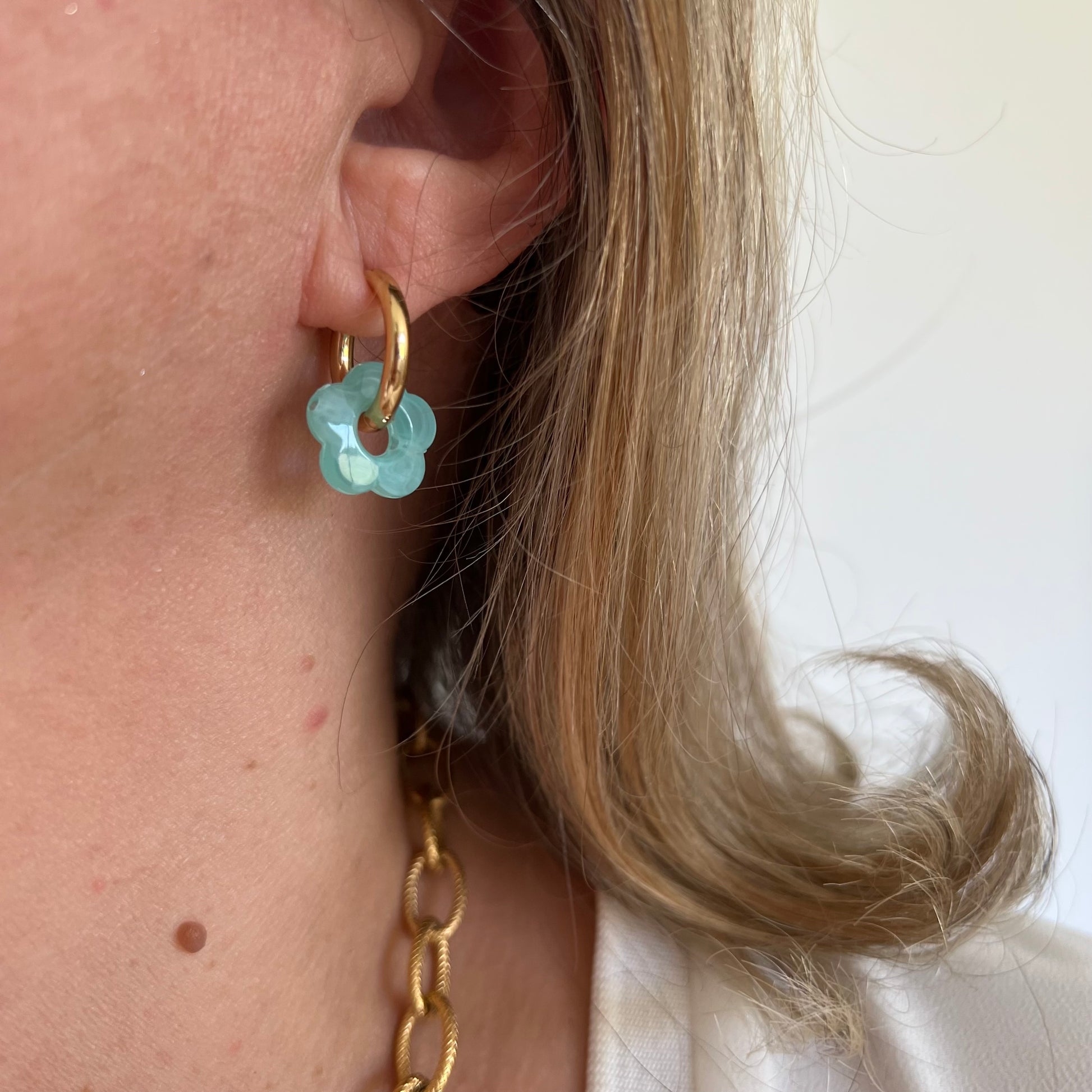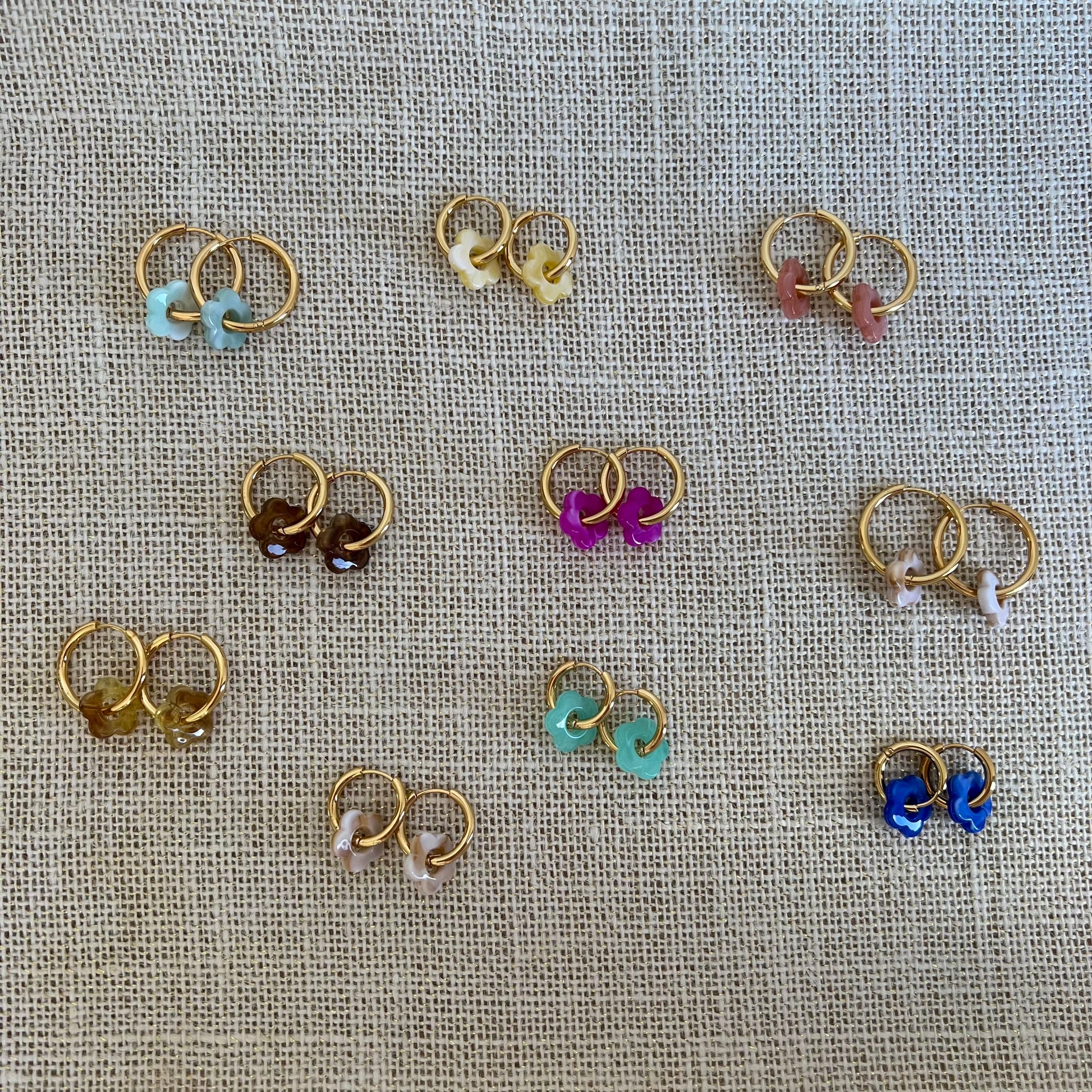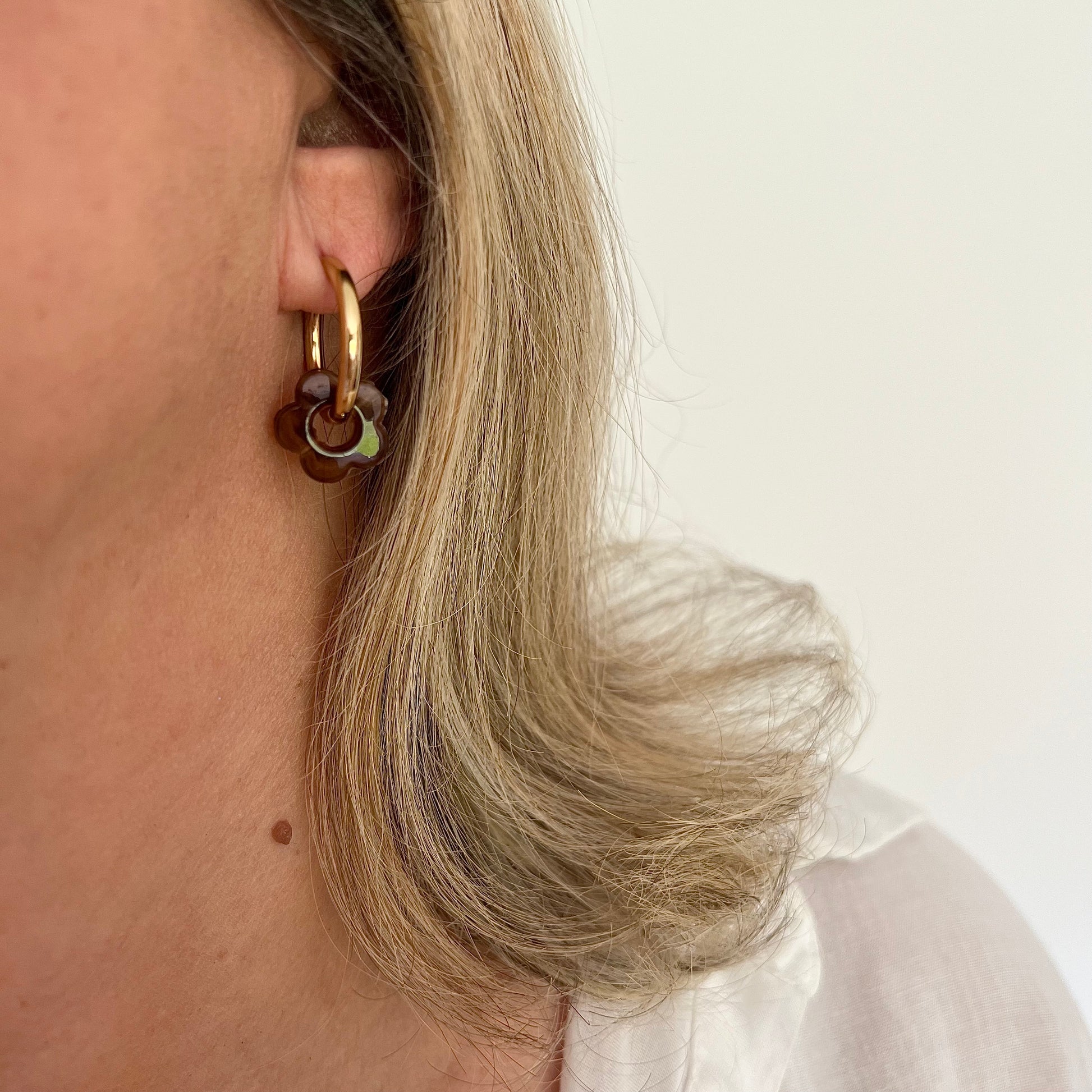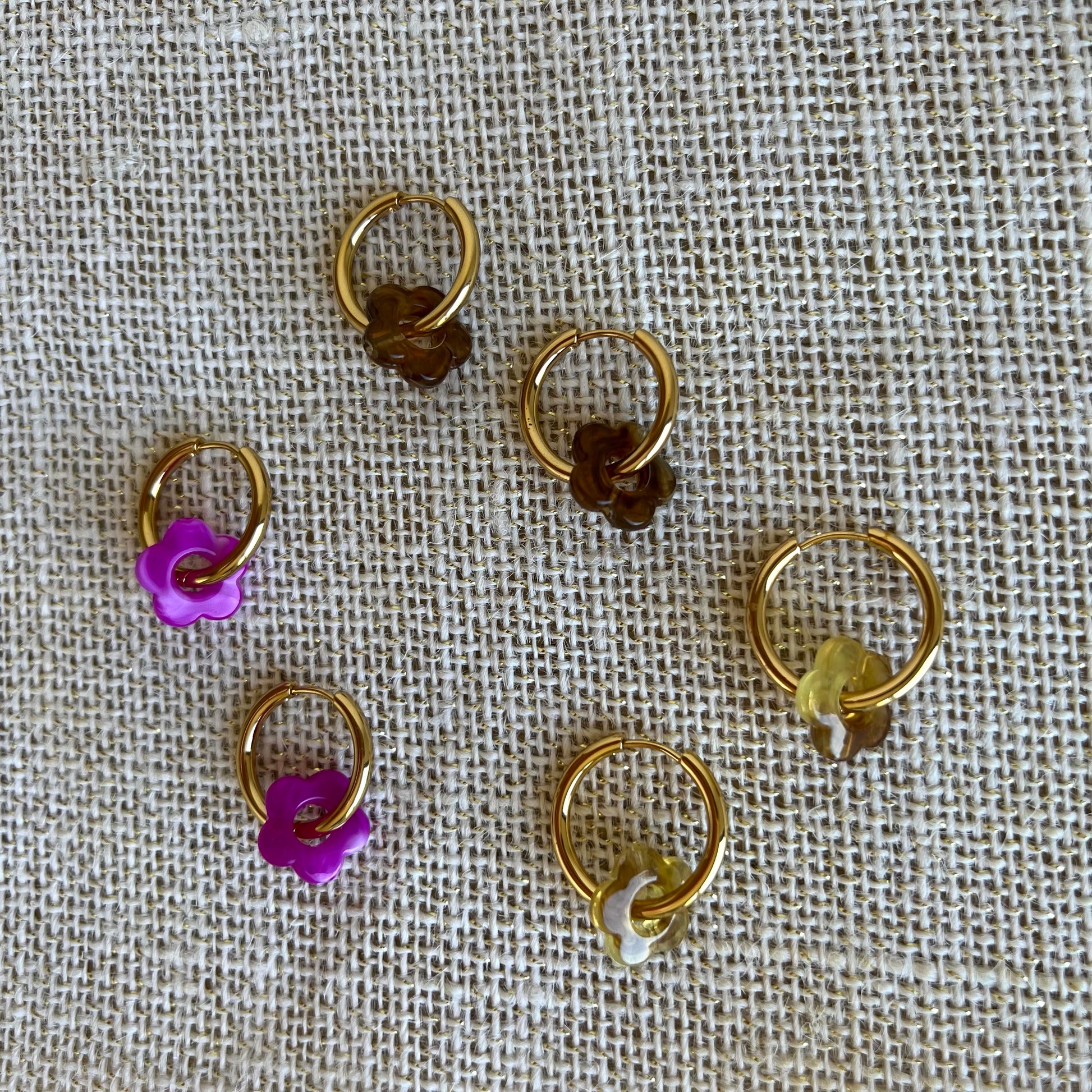 Créoles en acier inoxydable plaqué or et charms en résine en forme de fleur creuse.